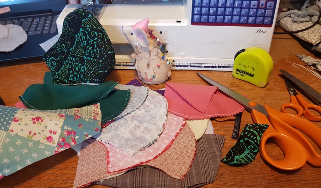 Each mask has 4 pieces, so I cut out 40 pieces of fabric. Each piece of fabric also requires interfacing, so I also cut out 40 pieces of interfacing – just had enough! I had never planned on making this many and after a while my neck and shoulders began to ache. I had a break for some lunch, came back, ironed on all the interfacing and started sewing all the sides together to form the front and backs…….
