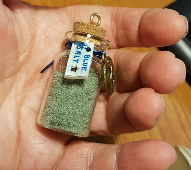 However, I wanted mine to be a true blue and as this is for magical use and not for consumption I finally decided to try just mixing the salt with blue ink…. one of Hubby’s spare ink cartridges for his fountain pen did the trick….